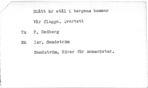 //// Blått är stål i bergens kammar //// Vår flagga. Qvartett //// Tx F. Hedberg //// Mk Isr. Sandström //// Sandström, Körer för mansröster. ////