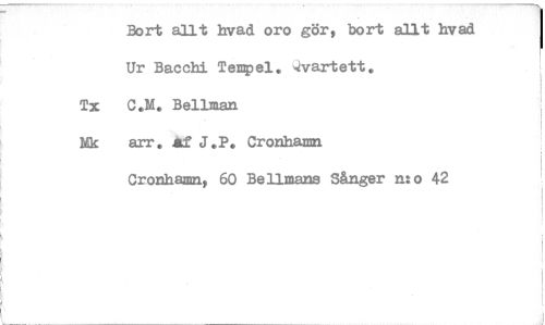 //// Bort allt hvad oro gör, bort allt hvad //// Ur Bacchi Tempel. ,Qvartett. //// Tx C.M. Bellman //// Mk arr. If J.P. Cronhamn //// Cronhamn, 60 Banalare Sånger n:o 42 ////