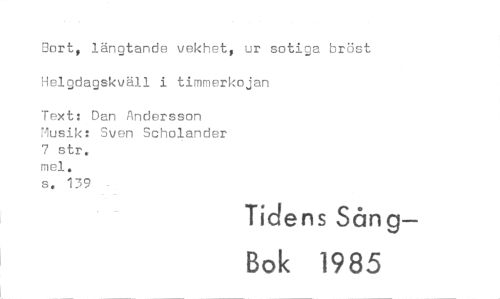//// Bort, längtande vekhet, ur sotiga bröst Helgdagskväll i timmerkojan //// Text: Dan Andersson Musik: Sven Scholander 7 str. //// mel. //// s. 139 //// Tidens Sån g— //// Bok 1985 ////