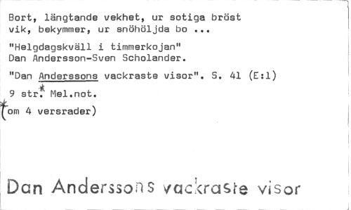 //// Bort, längtande vekhet, ur sotiga bröst vik, bekymmer, ur snöhöljda bo ... //// "Helgdagskväll i timmerkojan" Dan Andersson-Sven Scholander. //// "Dan Anderssons vackraste visor". S. 41 (E:1) 9 str. Mel.not. //// tom 4 versrader) //// - -1 //// Dan Anderssons vackraste visor ////