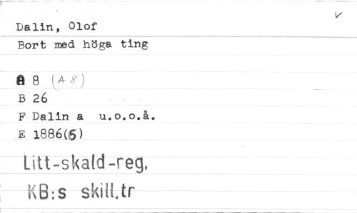 //// Dalin, Olof //// Bort med höga ting //// A 8 (A - //// B 26 //// F Dalin a u.o.o.å. E 1886(6) //// Litt-skald-reg, //// KB:s skiltötr ////