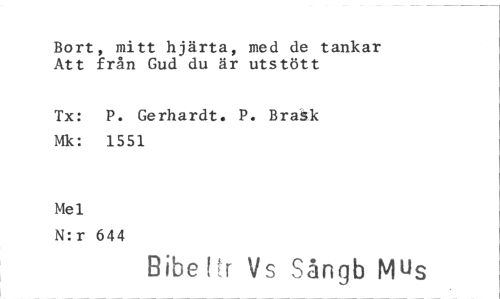//// Bort, mitt hjärta, med de tankar Att från Gud du är utstött //// Tx: P. Gerhardt. P. Brask Mk: 1551 //// Mel //// N:r 644 //// Bibe I r Vs Sångb Mus ////