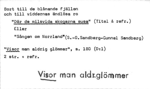 //// Bort till de blånande fjällen och till viddernas ändlösa ro //// "Där de milsvida skogarna susa" (Titel & refr.) Eller //// "Sången om Norrland" (S.-0.Sandberg-Gunnel Sandberg) //// "Visor man aldrig glömmer", s. 180 (D:1) 2 str. + refr. //// Visor man als:h:glömmer ////