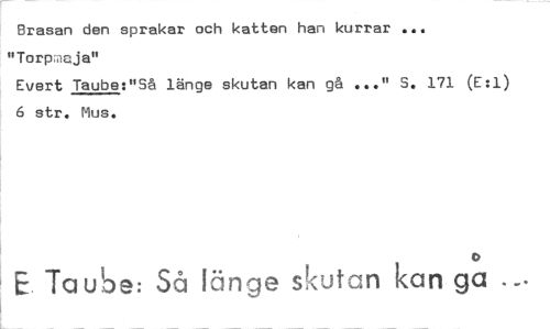 //// Brasan den sprakar och katten han kurrar ... "Torv:oja" //// Evert Taube:"Så länge skutan kan gå .,." S. 171 (E:1) 6 str. Mus. //// 0 //// E. Taube: Så länge skutan kan ga ////
