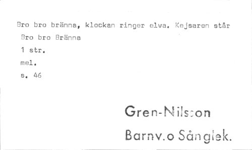//// Bro bro bränna, klockan ringer elva. Kejsaren står //// Bro bro Bränna //// 1 str. //// mel. //// s. 46 //// Gren-N i! :on //// Barnv.o Sån gåk. ////