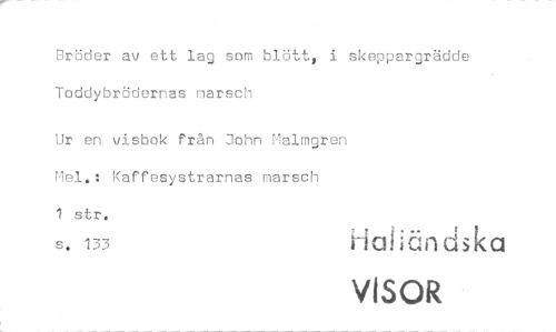 //// Bröder av ett lag som blött, i skeppargrädde Toddybrödernas narsch //// Ur en visbok från John Malmgren Mal.: Kaffesystrarnas marsch 1 str. //// s. 133 Haiiänciska //// VISOR ////