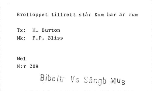 //// Brölloppet tillrett står Kom här är rum //// Tx: H. Burton Mk: P.P. Bliss //// Mel //// N:r 209 //// Bibeltr Sångb Mus ////