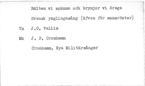 //// Bälten vi spänna och brynjor vi draga Svensk ynglingasång (äfVen för mansröster) Tx J.O. Wallin //// Ek J. P. Cronhamn //// Cronhaan, Nya Militärsånger ////