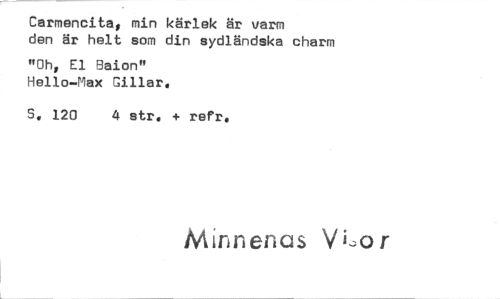 //// Carmencita, min kärlek är varm den är helt som din sydländska charm //// "Oh, El Baion" Hello—Max Gillar. //// 5. 120 4 str. + refr. //// Minnenas Vi,or ////