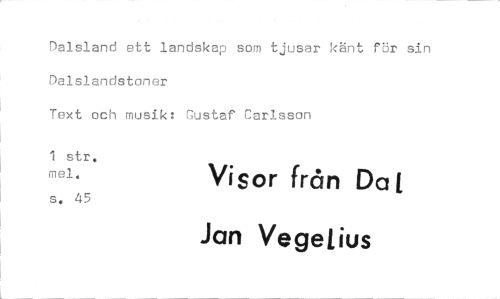 //// Dalsland ett landskap som tjusar känt för sin Dalslandstoner //// Text och musik: Gustaf Carlsson //// 1 str. //// mel. Visor från Da t //// s. 45 //// Jan Vegetius ////