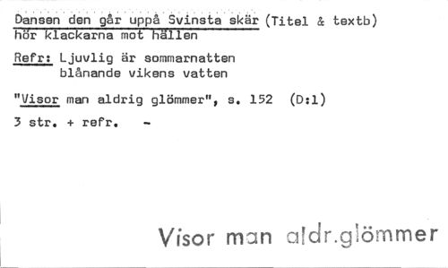 //// Dansen den går uppå Svinsta skär (Titel & textb) hör klackarna mot hällen //// Refr: Ljuvlig är sommarnatten blånande vikens vatten //// "Visor man aldrig glömmer", s. 152 (D:1) 3 str. + refr. //// Visor mJn a dr.glömmer ////