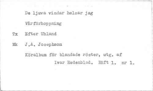 //// De ljuva vindar helsar jag //// Vårförhoppning Tx Efter Uhland Mk J.A. Josephson //// Köralbum för blandade röster, utg. af Ivar Hedenblad. Häft I. nr 1. ////