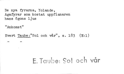 //// De nya fyrarna, Yolande, Agafyrar som kostat uppfinnaren hans ögons ljus //// "Ankomst" //// Evert Taube:"Sol och vår", s. 183 (E:1) //// E. Teni!-e: .o, och vår ////