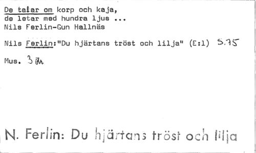 //// De talar om korp och kaja, de letar med hundra ljus ... Nils Ferlin-Gun Hallnäs //// Nils Ferlin:"Du hjärtans tröst och lilja" (E:1) 51T //// Mus. :)6,t4, //// N. Ferlin: Du hjärtan tröst oci Mia ////