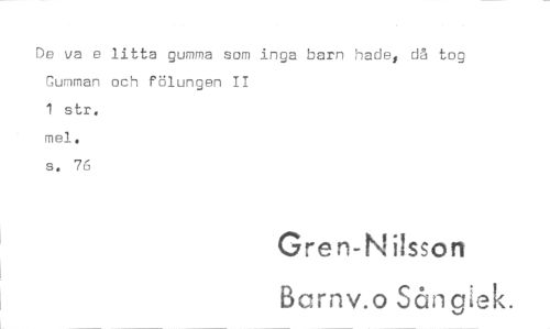 //// De va e litta gumma som inga barn hade, då tog //// Gumman och fölungen II //// 1 str. //// mel. //// s. 76 //// Gren-Nilsson //// Barnv.o Sån gi k. ////