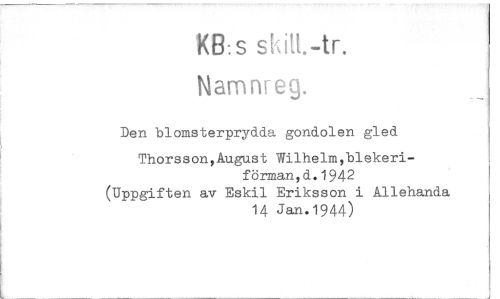 //// KB:s skitt.-tr. //// Namnreg. //// Den blomsterprydda gondolen gled //// Thorsson,August Wilhelm,blekeriförman,d.1942 //// (Uppgiften av Eskil Eriksson i Allehanda //// 14 Jan.1944) ////