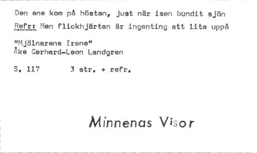 //// Den ene kom på hösten, just när isen bdndit sjön Refr: Men flickhjärtan är ingenting att lita uppå //// "Mjölnarens Irene" //// Åke Gerhard-Leon Landgren //// S. 117 3 str. refr. //// Minnenas Visor ////