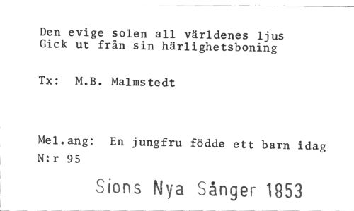 //// Den evige solen all världenes ljus Gick ut från sin härlighetsboning //// Tx: M.B. Malmstedt //// Mel.ang: En jungfru födde ett barn idag N:r 95 //// Sions Nya Sånger 1853 ////