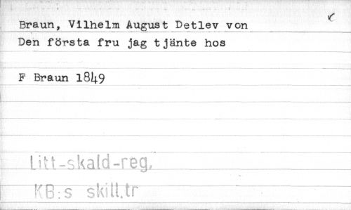 //// Braun, Vilhelm August Detlev von Den första fru jag tjänte hos //// F Braun 1849 //// 1 iu_skald-reg-, //// o:q stan- ////