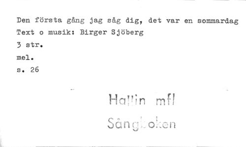 //// Den första gång jag såg dig, det var en sommardag //// Text o musik: Birger Sjöberg //// 3 str. //// mel. //// s. 26 //// Ha!!i //// Sånci ." fl ////