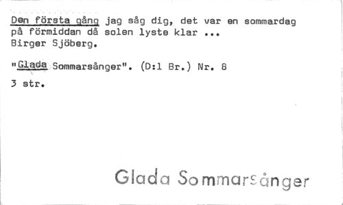//// Den första gång jag såg dig, det var en sommardag på förmiddan då solen lyste klar ... Birger Sjöberg. //// Sommarsånger". (D:1 Br.) Nr. 8 //// 3 str. //// Glada So rrynarsånger ////