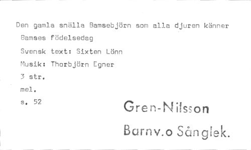 //// Den gamla snälla Bamsebjörn som alla djuren känner //// Bamses födelsedag //// Svensk text: Sixten Lönn //// Musik: Thorbjörn Egner //// 3 str. //// mel. //// s. 52 Gren-Nilsson //// Barnv.o Sångek. ////