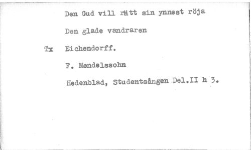 //// Den Gud vill rätt sin ynnest röja //// Den glade vandraren //// Tx Eichendorff. //// F. Mendelssohn //// Hedenblad, Studentsången Del.II h 3. ////