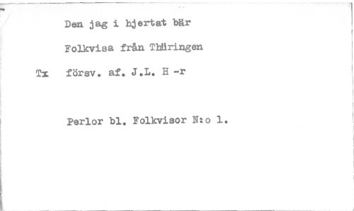 //// Den jag i hjertat bär Folkvisa från Tbaringen Tx försv. af. J.L. H -r //// Perlor bl. Folkvisor N:o 1. ////