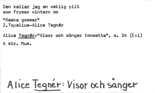 //// Den kallar jag en veklig pilt som fryser vintern om //// "Raska gossar" //// Z.Topelius—Alice Tegnér //// Alice Teqnår:"Visor och sånger tonsatta", s. 24 (E:1) 4 str. Mus. //// Rike Tecre å //// .r: Visor och sngex ////
