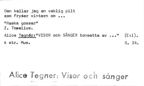 //// Den kallar jag en veklig pilt som fryser vintern om ... //// "Raska gossar" Z. ToRelius. //// Alice Teqnår:"VISOR och SANGER tonsatta av ..." (E:1). //// 4 str. Mus. S. 24. //// Alice regnen Visor ()ii sånger ////