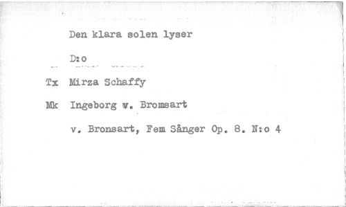 //// Den. klara solen lyser //// Dzo //// Tx Mirza Schaffy //// Nk Ingeborg v. Bromsart //// v. Bronsart, Fem Sånger Op. 8. N:o 4 ////