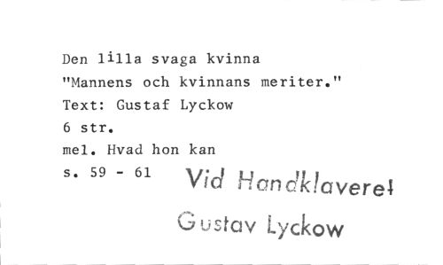 //// Den lilla svaga kvinna //// "Mannens och kvinnans meriter." //// Text: Gustaf Lyckow //// 6 str. //// mel. Hvad hon kan //// s. 59 - 61 Vid Handidavere4 //// "utav Lyckow ////
