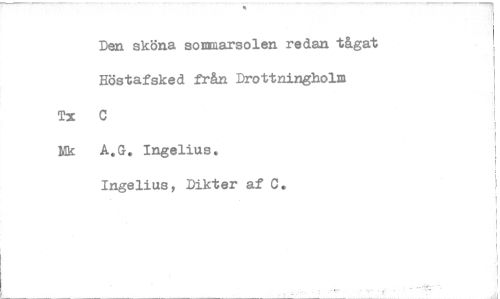 //// Den sköna sommarsolen redan tågat //// Höstafsked från Drottningholm //// Tx C //// Nk A.G. Ingelius. //// Ingelius, Dikter af C. ////