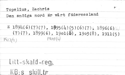 //// Topelius, Zachris //// Den snöiga nord är vårt fädernesland //// E 1894(6)(7)(7), 1995(4)(5)(6)(7), 1896(6) //// (7)(7), 1899(6), 19o1(&), 1903(8), 1911(5) //// 1dt-skald-rel. //// KB:s skUtr ////