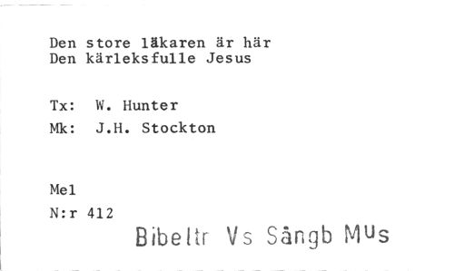//// Den store läkaren är här Den kärleksfulle Jesus //// Tx: W. Hunter //// Mk: J.H. Stockton //// Mel //// N:r 412 //// Bibel r Vs Sångb Mus ////