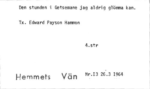 //// Den stunden i Getsemane jag aldrig glömma kan. //// Tx. Edward Payson Hamnron //// 4.str //// hemmets /än Nr.I3 26.3 1964 ////