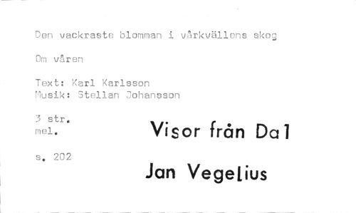 //// Den vackraste blomman i vårkvällens skog Om våren //// Text: Karl Karlsson //// Musik: Stellan Johansson //// 3 str. mel. Visor från Da 1 //// s. 202 Jan Vegelius ////