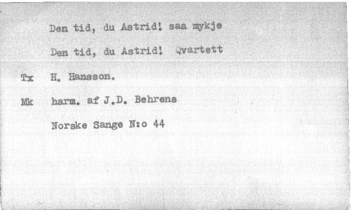 //// Den tid, du Astrid: saa mykje Den tid, du Astrid;, 4vartett Tx H. Hansson. //// Mk harm. af J.D. Behrens //// Norske Sange Nto 44 ////