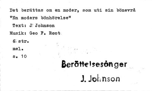 //// Det berättas om en moder, som uti sin bönevrå //// "En moders bönhörelse" //// Text: JTJohnson //// Musik: Geo 7. Root //// 63 str. //// mel. //// se 10 //// Ber8ttelRestfin ger //// nson ////