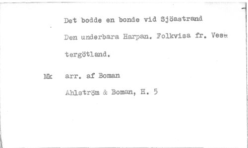//// Det bodde en bonde vid Sjöastrand //// Den underbara Harpan. Folkvisa fr. Veee tergötland. //// lik arr. af Boman //// Åhlström & Boman, H. 5 ////