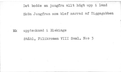 //// Det bodde en jungfru allt högt upp i land Skön Jungfrun som blef narrad af Tiggegubben //// Ek upptecknad i Blekinge //// Ståhl, Filikromen VIII Saml. N:o 3 ////