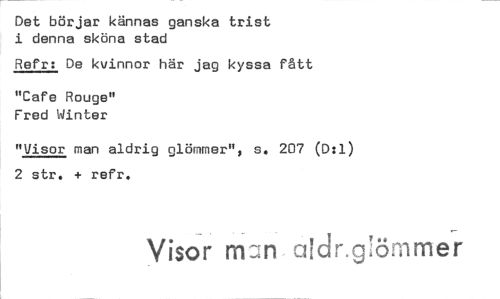 //// Det börjar kännas ganska trist i denna sköna stad //// Refr: De kvinnor här jag kyssa fått //// "Cafe Rouge" Fred Winter //// "Visor man aldrig glömmer", s. 207 (D:1) 2 str. + refr. //// Visor m:;:n aidng:örnmer ////
