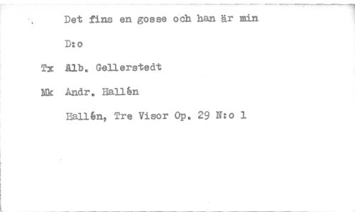 //// Det fins en gosse och han är min //// D.o. //// Tx Uh, Gellerstedt //// Ek Andr. Halllin //// Hallen, Tre Visor Op. 29 no 1 ////