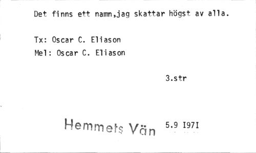 //// Det finns ett namn,jag skattar högst av alla. //// Tx: Oscar C. Eliason Mel: Oscar C. Eliason //// 3.str //// Hemmef N/4n 5.9 1971 ////