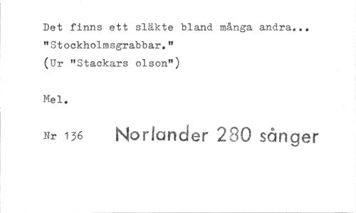 //// Det finns ett släkte bland många andra... "Stockholmsgrabbar." //// (Ur "Stackars olson") //// Mel. //// Nr 136 Norlander 230 sånger ////