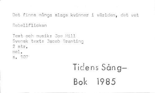 //// Det finns många slags kvinnor i världen, det vet Rebellflickan //// Text och musik: Joe Hill //// Svensk text: Jacob Branting //// 2 str. mel. //// s. 107 //// Tidens Sång— //// Bok 1985 ////