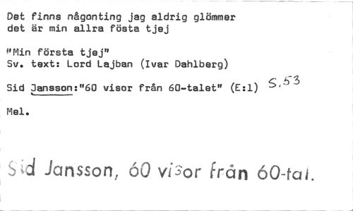//// Det finns någonting jag aldrig glömmer det är min allra fösta tjej //// "Min första tjej" //// Sv. text: Lord Lajban (Ivar Dahlberg) //// Sid Jansson:"60 visor från 60-talet" (E:1) -5'" Mel. //// Jansson, 60 visor från 6®-tak. ////