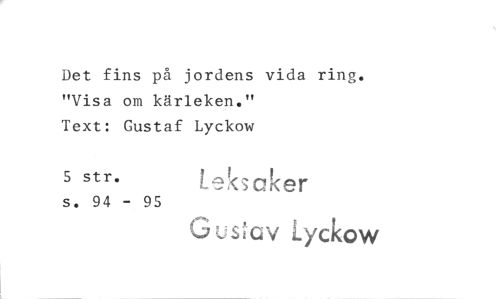 //// Det fins på jordens vida ring. "Visa om kärleken." Text: Gustaf Lyckow //// 5 str. i I //// s. 94 - 95 ,e,e eker //// Gustav Lyckow ////