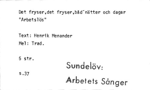 //// Det fryser,det fryser,bäd"nätter och dagar "Arbetslös" //// Text: Henrik Menander Mel: Trad. //// 5 str. //// Sundeiöv: //// s.37 //// Arbetets Sånger ////