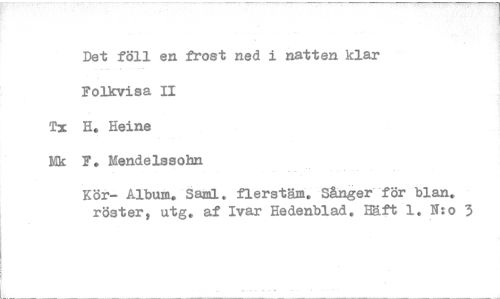 //// Det föll en frost ned i natten klar Folkvisa II //// Tx H. Heine //// Mk P. Mendelssohn //// Kör- Album. Saml. nerstäm. Sånger för blar. röster, utg. af Ivar Hedenblad. nätt 1. N:o 3 ////